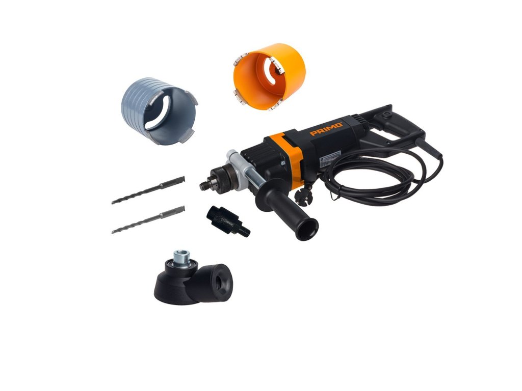 Se setem vysokootáčkové vrtačky PRIMO s příslušenstvím můžete své pracovní procesy při využití termokrabic PRIMO ještě více optimalizovat. Základem sady je výkonná vysokootáčková vrtačka s nominální rychlostí 2 050 otáček za minutu. Set dále obsahuje redukci připojení na odsávání, adaptér SDS, dva středicí vrtáky a dvě diamantové korunky 82 mm. Jednu pro materiály do hrubé hustoty 2,0 (zdivo a lehký beton), druhou pro materiály s hrubou hustotou nad 2,0 ( vysoce stlačené vápenopískové cihly nebo beton). V případě tvrdších materiálů lze pomocí otočného prstence v hlavě vrtačky nastavit měkký příklep. Kovová převodovka zajišťuje dlouhou životnost vrtačky. Vrtačka je vybavena také elektronickým systémem plynulého rozběhu. Přesné vyvrtání otvoru zamezí poškození stěny.